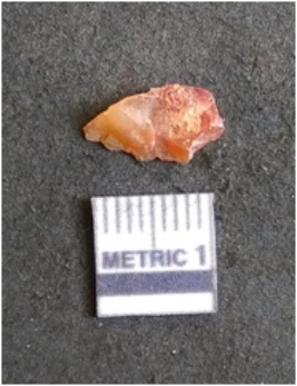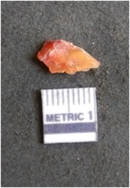 | Description / विवरण | The carnelian flake is red in color, with angular flaked edges and a bulbous end. The piece has sharp pointed end and a crypto-crystalline matrix. The piece is reddish in color; with silica base. |