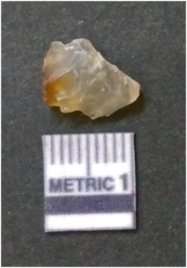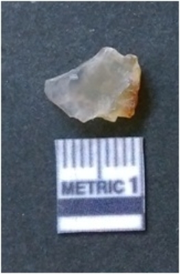 | Description / विवरण | It is chalcedony flake, translucent in appearance. The piece shows sharp pointed ends and flake scars on the surface as a result of flaking. The piece shows a bulb of percussion. |