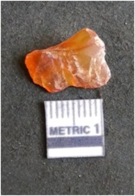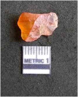 | Description / विवरण | The carnelian flake is red in color, with angular flaked edges and a bulbous end. The piece has sharp pointed end and a crypto-crystalline matrix. The piece is reddish in color; with silica base. |
