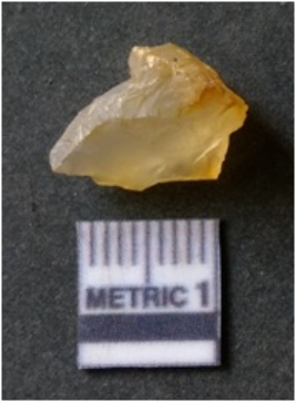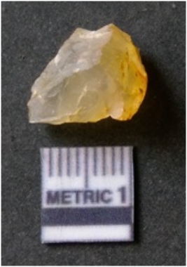 | Description / विवरण | It is chalcedony flake, translucent in appearance. The piece shows sharp pointed ends and flake scars on the surface as a result of flaking. The piece shows a bulb of percussion. |