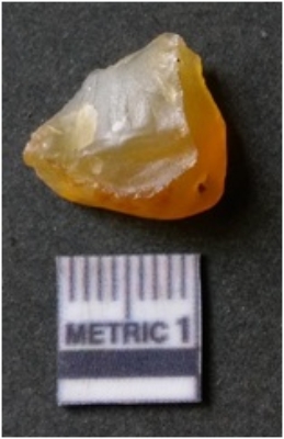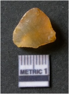 | Description / विवरण | It is chalcedony flake, translucent in appearance. The piece shows sharp pointed ends and flake scars on the surface as a result of flaking. The piece shows a bulb of percussion. |