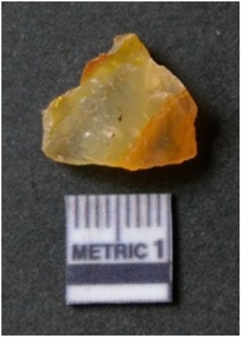 | Description / विवरण | It is chalcedony flake, translucent in appearance. The piece shows sharp pointed ends and flake scars on the surface as a result of flaking. The piece shows a bulb of percussion. |