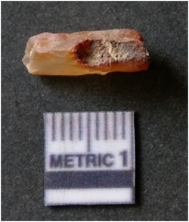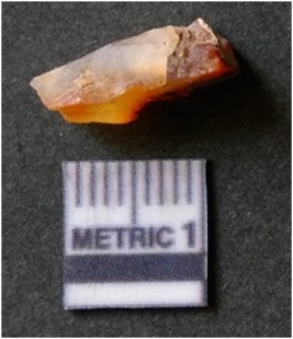 | Description / विवरण | It is chalcedony flake, translucent in appearance. The piece shows sharp pointed ends and flake scars on the surface as a result of flaking. The piece shows a bulb of percussion. |
