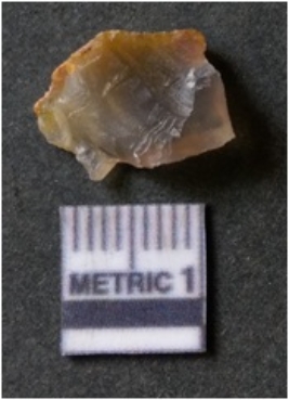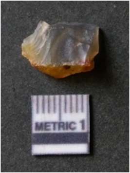 | Description / विवरण | The agate piece is translucent in appurtenance, with angular flaked edges and a bulb of percussion. The piece shows flake scars on the surface. |