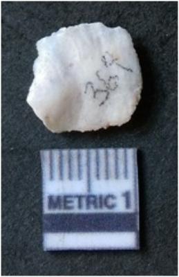 | Description / विवरण | The quartz flake has sharp flaked edges and pointed ends as a result of flaking. The piece is semi-transparent in nature with irregular fracture pattern. The piece is roughly triangular in shape and has a prominent bulb of percussion. |