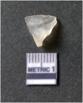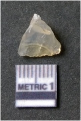 | Description / विवरण | The quartz flake has sharp flaked edges and pointed ends as a result of flaking. The piece is semi-transparent in nature with irregular fracture pattern. The piece is roughly triangular in shape and has a prominent bulb of percussion. |