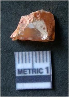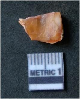 | Description / विवरण | It is chalcedony flake, translucent in appearance. The piece shows sharp pointed ends and flake scars on the surface as a result of flaking. The piece shows a bulb of percussion. |