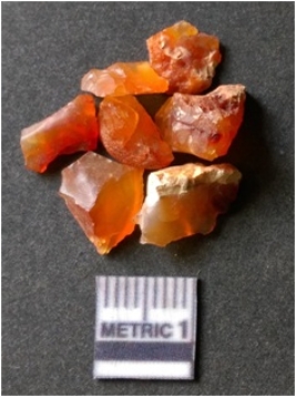 | Description / विवरण | It is carnelian flake red in color, with sharp flakes edges and a small bulb of percussion owing to knapping activity. The piece has sharp flaked edges and a crypto-crystalline matrix. |