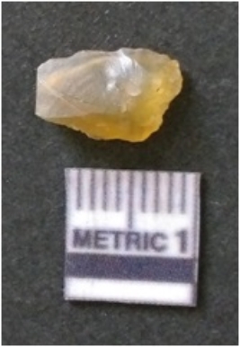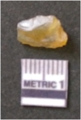 | Description / विवरण | The chalcedony flake is pale in color and translucent in appearance. The piece has s harp flaked ends and a bulbous end due to flaking. The flake has a crypto-crystalline silica matrix. |