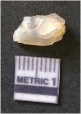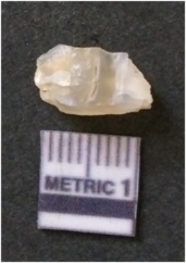 | Description / विवरण | The chalcedony flake is pale in color and translucent in appearance. The piece has s harp flaked ends and a bulbous end due to flaking. The flake has a crypto-crystalline silica matrix. |
