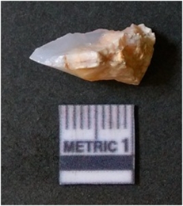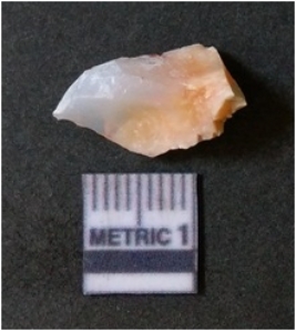 | Description / विवरण | The flake has irregular fracture pattern and sharp flaked edges as a result of lithic knapping activity. The piece is pale, with surfacial flake scars and a bulbous end. The quartz flake is rosy white in colour. |