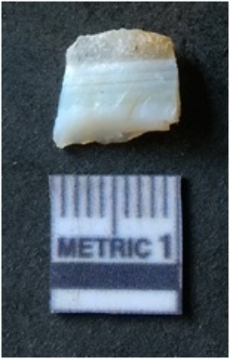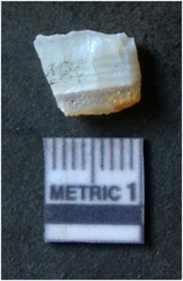 | Description / विवरण | The banded agate piece is crystalline in nature, with a smooth fracture pattern and visible bands on the flaked sides. The piece is pale in color and has sharp flaked ends. |