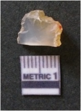 | Description / विवरण | The chalcedony flake is pale in color and translucent in appearance. The piece has s harp flaked ends and a bulbous end due to flaking. The flake has a crypto-crystalline silica matrix. |