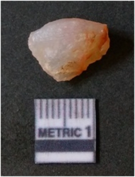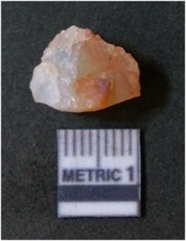 | Description / विवरण | The flake has irregular fracture pattern and sharp flaked edges as a result of lithic knapping activity. The piece is pale, with surfacial flake scars and a bulbous end. The quartz flake is rosy white in colour. |