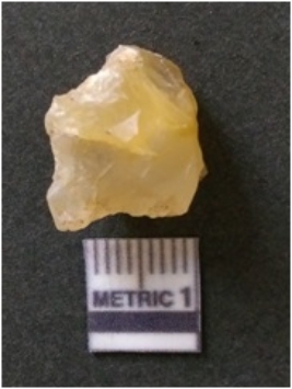 | Description / विवरण | The chalcedony flake is pale in color and translucent in appearance. The piece has s harp flaked ends and a bulbous end due to flaking. The flake has a crypto-crystalline silica matrix. |