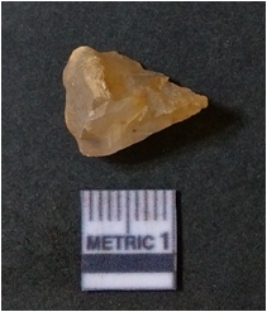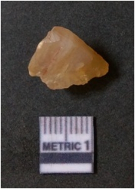 | Description / विवरण | It is chalcedony flake, translucent in appearance. The piece shows sharp pointed ends and flake scars on the surface as a result of flaking. The piece shows a bulb of percussion. |
