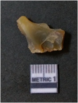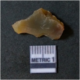 | Description / विवरण | The flake has irregular fracture pattern and sharp flaked edges as a result of lithic knapping activity. The piece is pale, with surfacial flake scars and a bulbous end. The flake is of smoky quartz variety, grayish in colour and translucent in appearance. |
