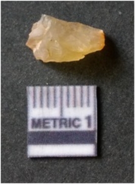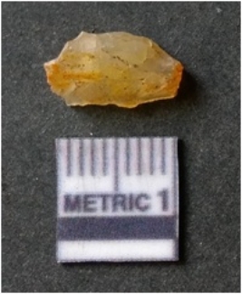 | Description / विवरण | It is chalcedony flake, translucent in appearance. The piece shows sharp pointed ends and flake scars on the surface as a result of flaking. The piece shows a bulb of percussion. |