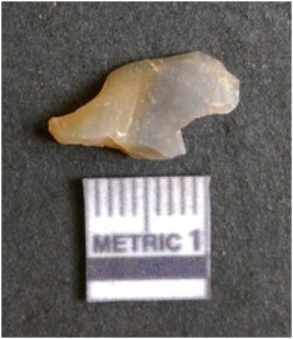 | Description / विवरण | The flake has irregular fracture pattern and sharp flaked edges as a result of lithic knapping activity. The piece is pale, with surface flake scars and a bulbous end. The flake is of smoky quartz variety, grayish in color and translucent in appearance. |