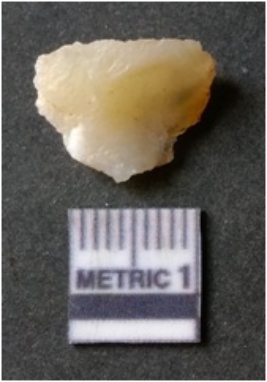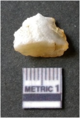 | Description / विवरण | The quartz flake has sharp flaked edges and pointed ends as a result of flaking. The piece is semi-transparent in nature with irregular fracture pattern. The piece is roughly triangular in shape and has a prominent bulb of percussion. |