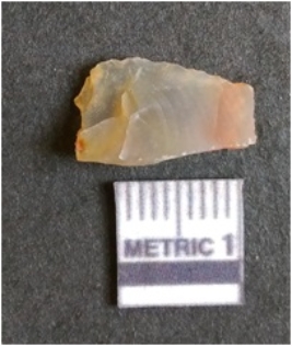 | Description / विवरण | The flake has irregular fracture pattern and sharp flaked edges as a result of lithic knapping activity. The piece is pale, with surface flake scars and a bulbous end. The flake is of smoky quartz variety, grayish in color and translucent in appearance. |