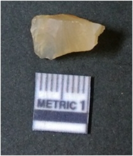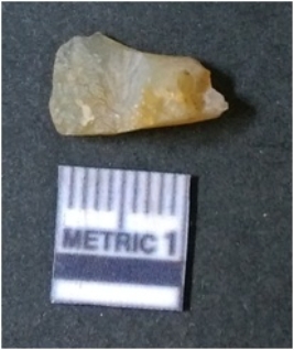 | Description / विवरण | It is chalcedony flake, translucent in appearance. The piece shows sharp pointed ends and flake scars on the surface as a result of flaking. The piece shows a bulb of percussion. |