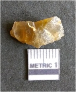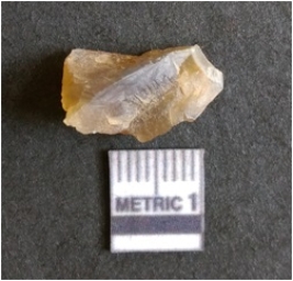 | Description / विवरण | The flake has irregular fracture pattern and sharp flaked edges as a result of lithic knapping activity. The piece is pale, with surface flake scars and a bulbous end. The flake is of smoky quartz variety, grayish in color and translucent in appearance. |