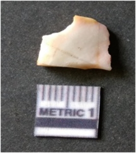 | Description / विवरण | The quartz flake has sharp flaked edges and pointed ends as a result of flaking. The piece is semi-transparent in nature with irregular fracture pattern. The piece is roughly triangular in shape and has a prominent bulb of percussion. |
