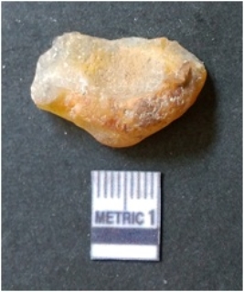| Description / विवरण | It is chalcedony flake, translucent in appearance. The piece shows sharp pointed ends and flake scars on the surface as a result of flaking. The piece shows a bulb of percussion. |