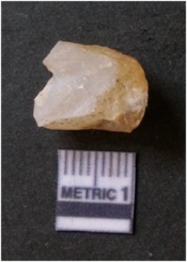 | Description / विवरण | The quartz flake has sharp flaked edges and pointed ends as a result of flaking. The piece is semi-transparent in nature with irregular fracture pattern. The piece is roughly triangular in shape and has a prominent bulb of percussion. |