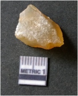 | Description / विवरण | It is chalcedony flake, translucent in appearance. The piece shows sharp pointed ends and flake scars on the surface as a result of flaking. The piece shows a bulb of percussion. |