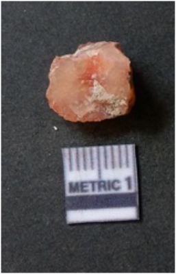 | Description / विवरण | The flake has irregular fracture pattern and sharp flaked edges as a result of lithic knapping activity. The piece is pale, with surfacial flake scars and a bulbous end. The quartz flake is rosy white in colour. |