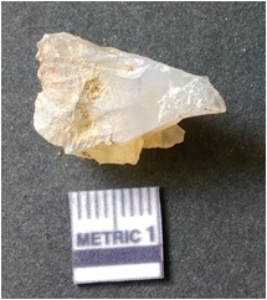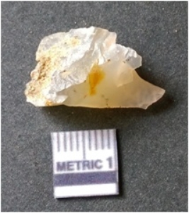 | Description / विवरण | It is chalcedony flake, translucent in appearance. The piece shows sharp pointed ends and flake scars on the surface as a result of flaking. The piece shows a bulb of percussion. |