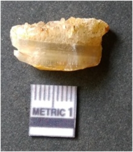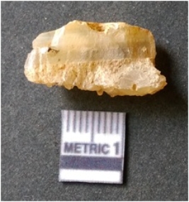 | Description / विवरण | The banded agate piece is crystalline in nature, with a smooth fracture pattern and visible bands on the flaked sides. The piece is pale in color and has sharp flaked ends. |