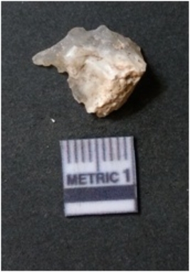 | Description / विवरण | The quartz flake has sharp flaked edges and pointed ends as a result of flaking. The piece is semi-transparent in nature with irregular fracture pattern. The piece is roughly triangular in shape and has a prominent bulb of percussion. |