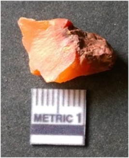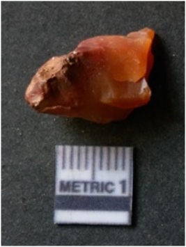 | Description / विवरण | It is carnelian flake red in color, with sharp flakes edges and a small bulb of percussion owing to knapping activity. The piece has sharp flaked edges and a crypto-crystalline matrix. |