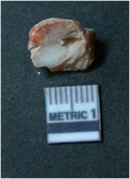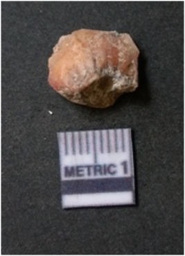 | Description / विवरण | The chert piece is dark in color, with a prominent bulb of percussion and sharp flaked edges. The piece is a part of lithic debitage or raw material for lithic knapping. The piece shows clear ripple marks and bulb of percussion. |
