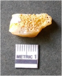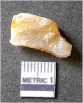 | Description / विवरण | It is chalcedony flake, translucent in appearance. The piece shows sharp pointed ends and flake scars on the surface as a result of flaking. The piece shows a bulb of percussion. |