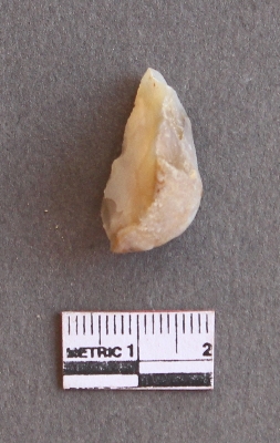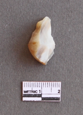 | Description / विवरण | This is a chalcedony stone fragment with cortex on one side, fine grain surface with bulb of percussion seen, and flaked edges, translucent. |