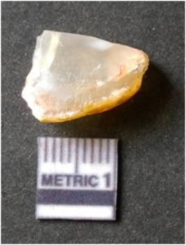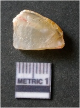 | Description / विवरण | It is chalcedony flake, translucent in appearance. The piece shows sharp pointed ends and flake scars on the surface as a result of flaking. The piece shows a bulb of percussion. |
