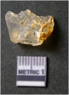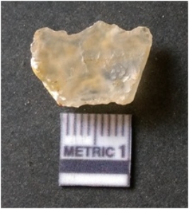 | Description / विवरण | It is chalcedony flake, translucent in appearance. The piece shows sharp pointed ends and flake scars on the surface as a result of flaking. The piece shows a bulb of percussion. |