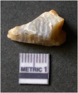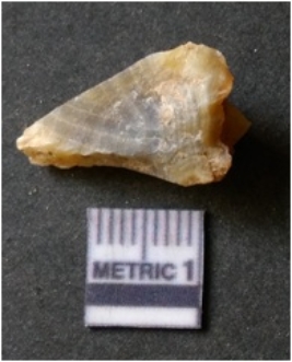 | Description / विवरण | The banded agate piece is crystalline in nature, with a smooth fracture pattern and visible bands on the flaked sides. The piece is pale in color and has sharp flaked ends. |