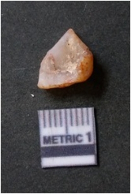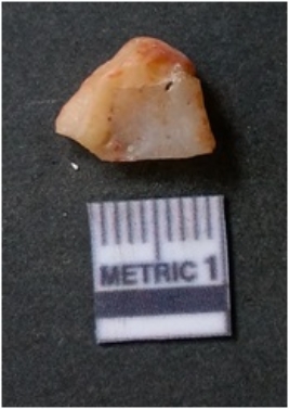 | Description / विवरण | The flake has irregular fracture pattern and sharp flaked edges as a result of lithic knapping activity. The piece is pale, with surfacial flake scars and a bulbous end. The quartz flake is rosy white in colour. |