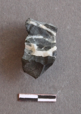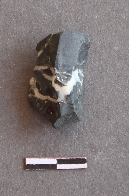| Description / विवरण | This is a jasper stone with white crystalline irregular bands. Fragment shows cut ridges with sharp edges. |