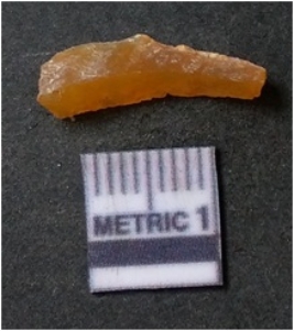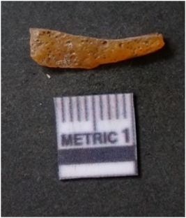 | Description / विवरण | The chalcedony flake is long and thin with sharp flaked edges and flake scars. The flake has a medium rides ands translucent crypto crystalline matrix making it a preferred material for lithic knapping. |