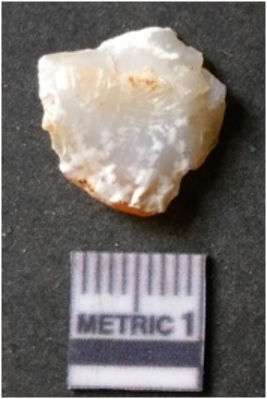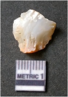 | Description / विवरण | The quartz flake has sharp flaked edges and pointed ends as a result of flaking. The piece is semi-transparent in nature with irregular fracture pattern. The piece is roughly triangular in shape and has a prominent bulb of percussion. |