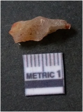 | Description / विवरण | The chert piece is dark in color, with a prominent bulb of percussion and sharp flaked edges. The piece is a part of lithic debitage or raw material for lithic knapping. The piece shows clear ripple marks and bulb of percussion. |