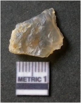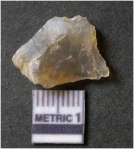 | Description / विवरण | The flake has irregular fracture pattern and sharp flaked edges as a result of lithic knapping activity. The piece is pale, with surfacial flake scars and a bulbous end. The flake is of smoky quartz variety, grayish in colour and translucent in appearance. |