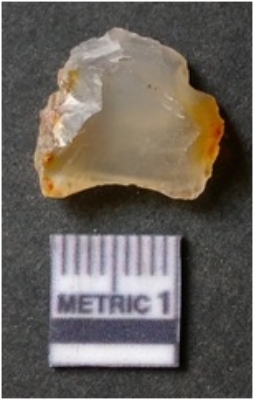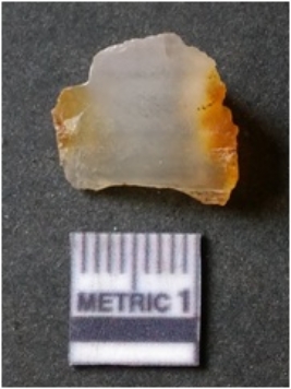 | Description / विवरण | It is chalcedony flake, translucent in appearance. The piece shows sharp pointed ends and flake scars on the surface as a result of flaking. The piece shows a bulb of percussion. |