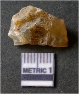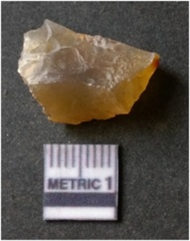 | Description / विवरण | It is chalcedony flake, translucent in appearance. The piece shows sharp pointed ends and flake scars on the surface as a result of flaking. The piece shows a bulb of percussion. |